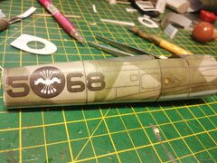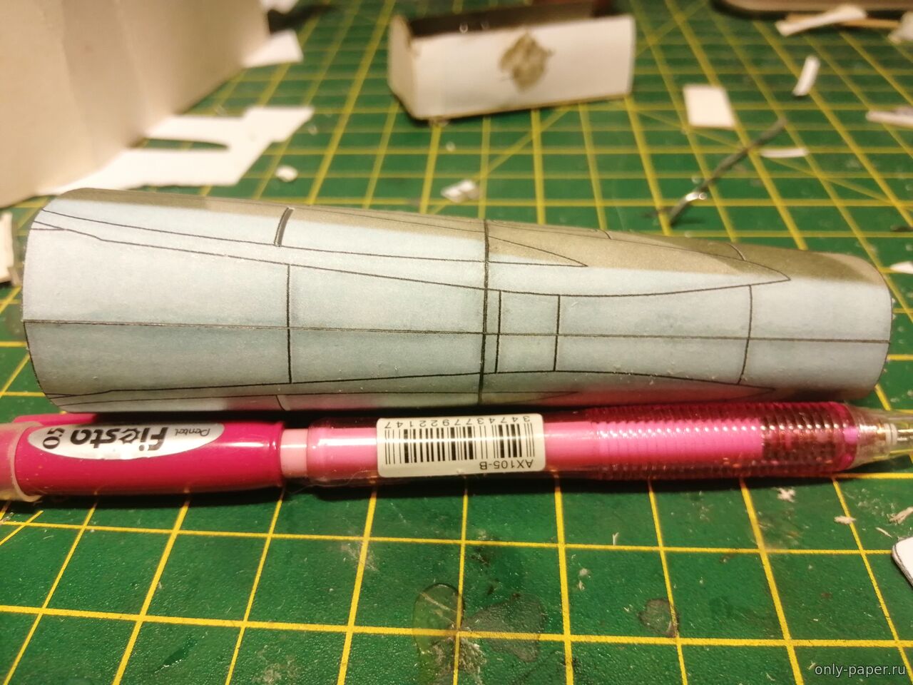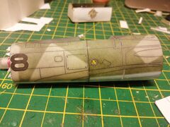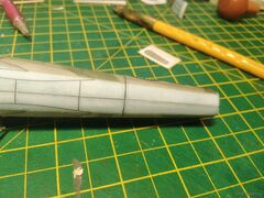 | Продолжаю сборку... Собрал 2 первые секции фюзеля. Стыки по темной окраске подкрасил простым карандашом, по голубому вообще не трогал. Склейки вырезал из упаковки офисной бумаги, она типа вощеная, при прокатке не дала рельефа, и чуть прочнее офиски. Стык клеил ПВА. Осталься доволен результатом, особенно когда клей высох, и подтянул обе секции по резу.
