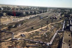 | Раз уж ЗИЛ из Ленинска (сейчас Байконур) , то привяжем его к местности... Посмотрим на фото, куда он сливал газ... На фото я отметил стрелочками свой дом и газозаливные колонки :