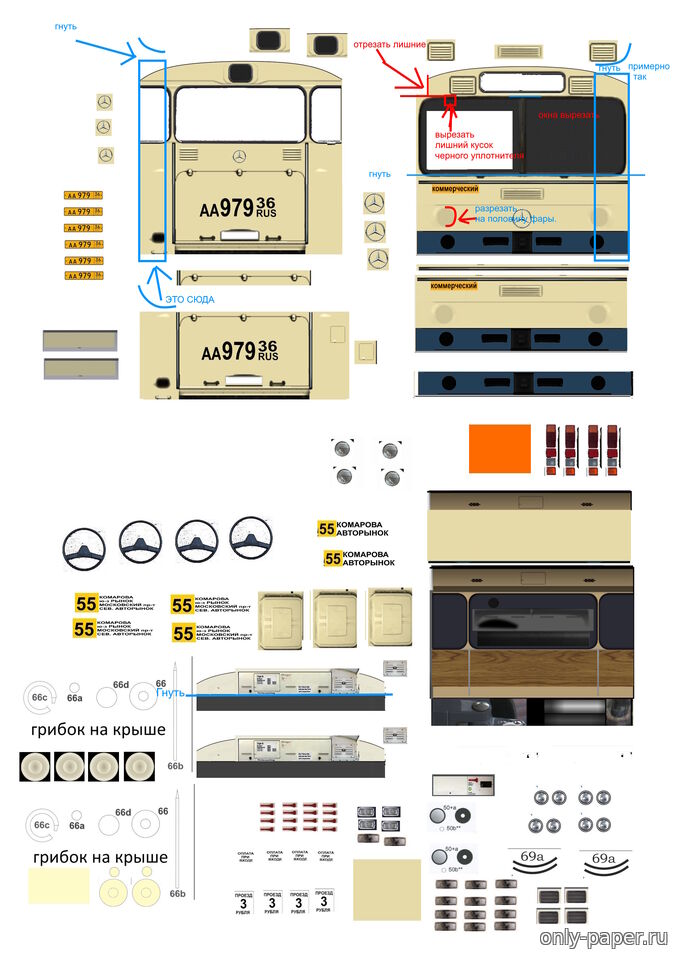 | Здравствуйте! Я собираю вашу бумажную модель автобуса Mercedes-Benz O307. Модель отличная, но я столкнулся с трудностью, на которой застрял уже долгое время. Я не могу понять, где именно нужно делать сгибы и придавать форму на передней и задней части (маски). Я пытался собрать их более 2 часов, но детали не садятся правильно. Не могли бы вы подсказать (или отметить на фото), по каким именно линиям нужно делать изгибы, чтобы получить правильную геометрию кузова? Заранее спасибо за помощь!