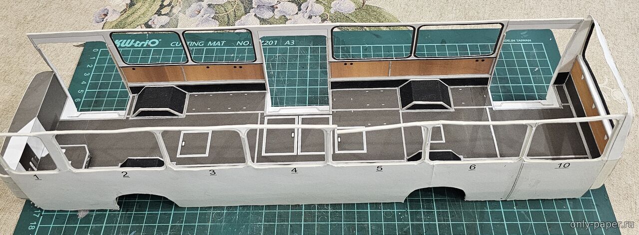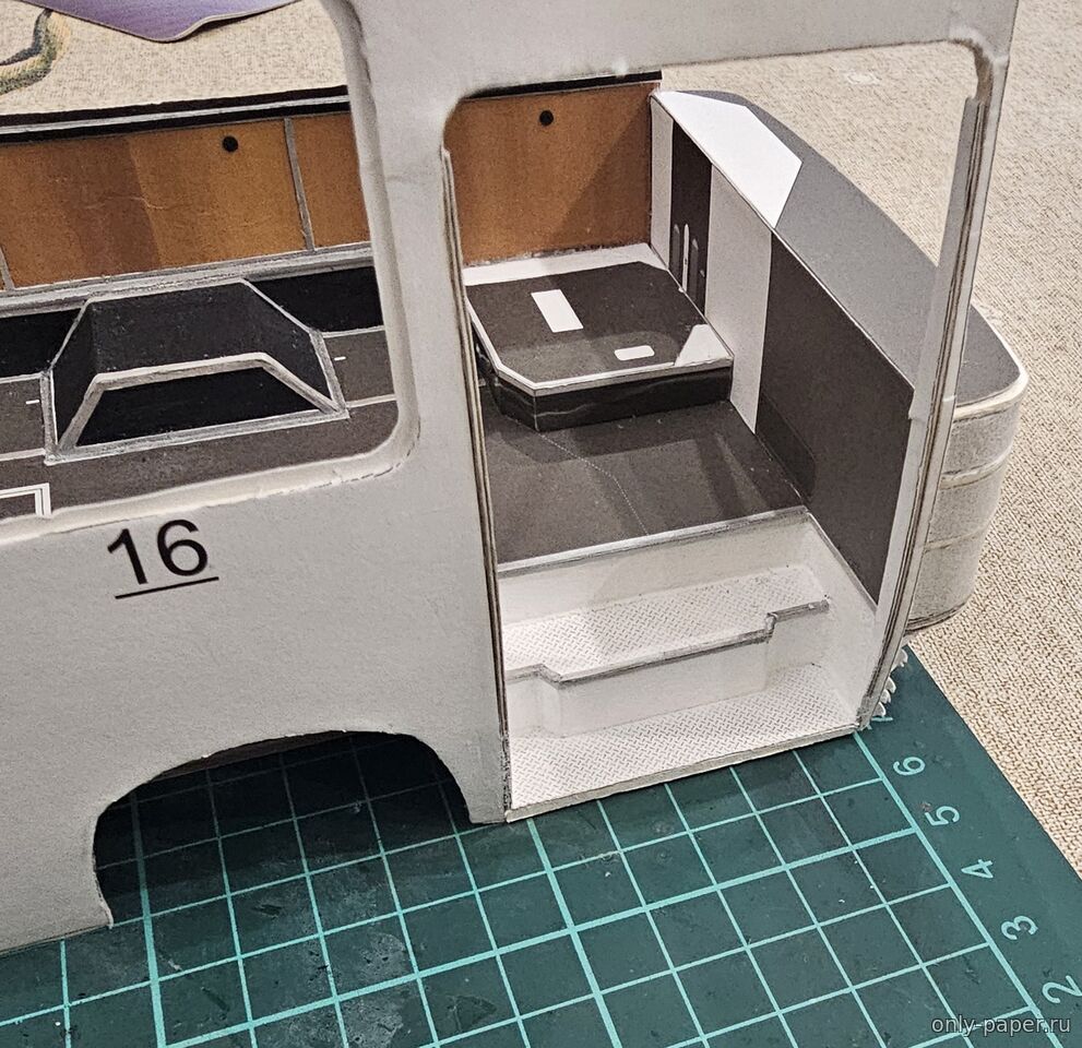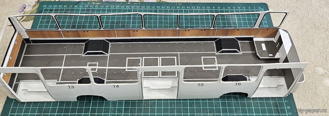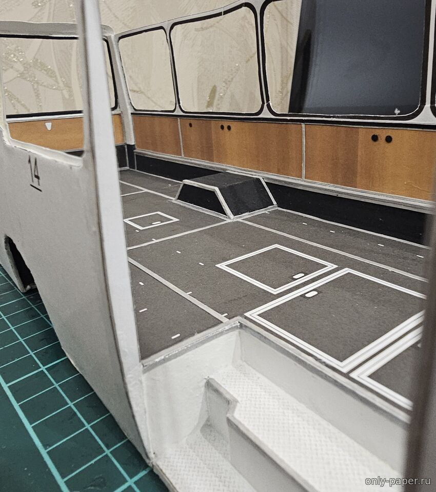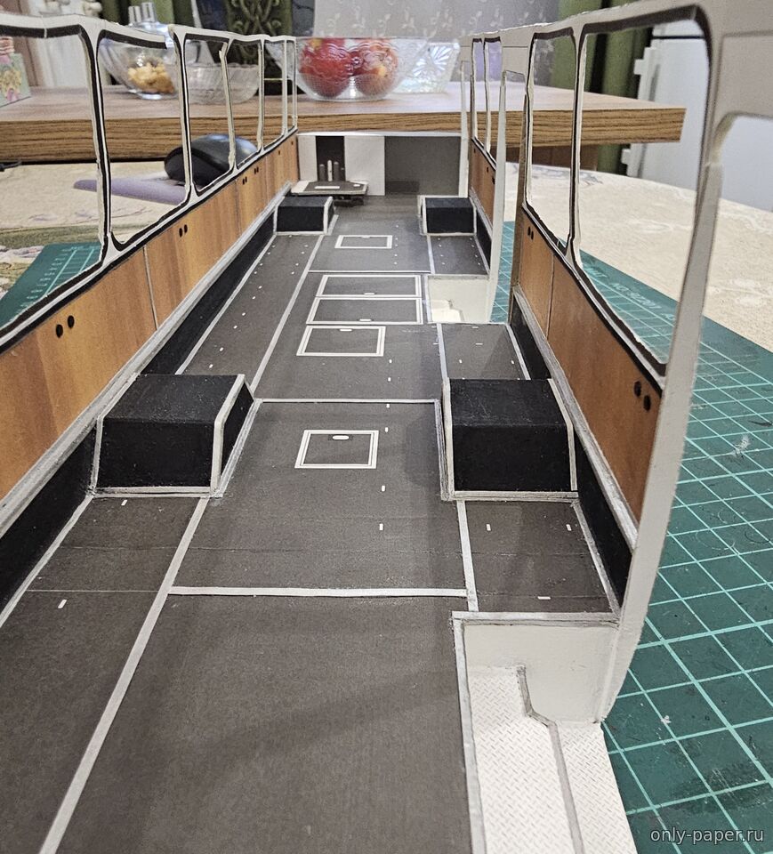 | Поработал с полами и внутреннней облицовкой. Найденные косяки вот по именно этому синиму Икарусу. На боковых листах под оргалит даже нет намека на присутствие в интерьере нижних выступов корпуса под ногами. Странно, в журнале с красным икарусом они хотя бы прорисованы, там есть. Почему разраб их не предусмотрел и они не перенесены из другого журнала- не понятно. Также соответственно и нет прорисованных на боковинах полос профилей, крепящих эту самую чистовую "обшивку" салона к корпусу. Нет круглых выводов воздуховодов.В общем все ушло в самостоятельный допил, т.к нарисованные местами профиля и отсутствие элементарных необходимых деталей не устраивают в таком масштабе. На пол, крылья и боковины добавлены профиля из серебрянки ( Бумага покрывалась заранее серебряным акрилом и шинковаласть на мелкие полоски шириной 1-1,2 мм ). Сзади вертикально по корпусу от пола до потолка возле заднего окна добавлены широкие каналы воздуховодов. В модели их тоже нет. Снизу сделаны выступы корпуса с профилями. Добавил кружочки вентиляции салона ( плашка черного цвета с заклепками 2мм от Моделик ). Далее работа с внутренней частью окон и т.д. Надо все приводить в порядок. Продолжение следует.
