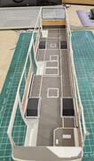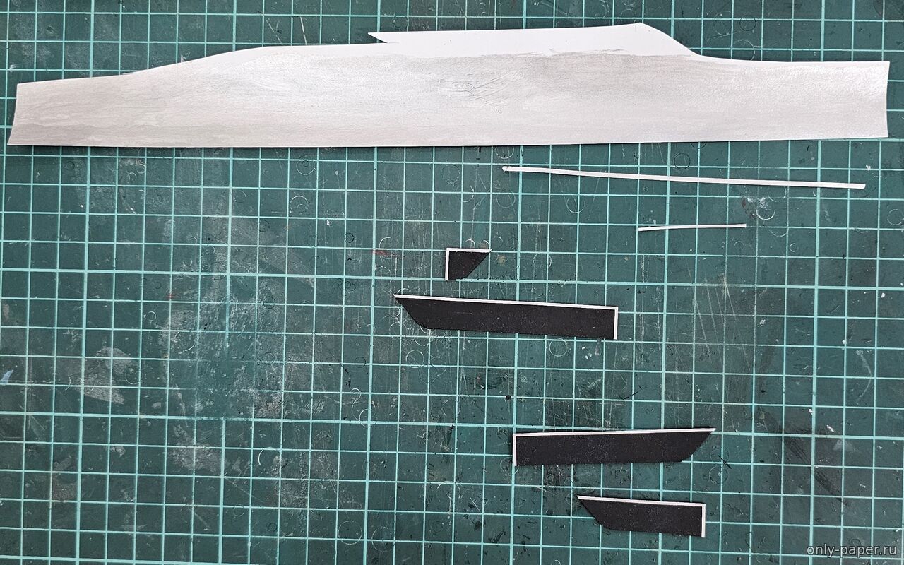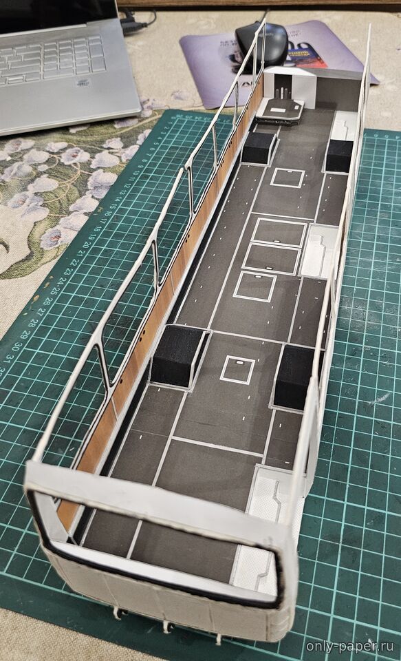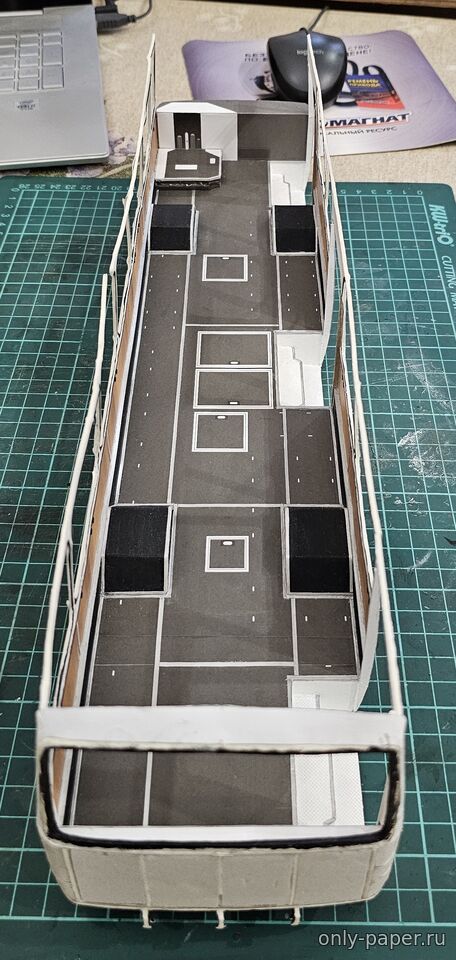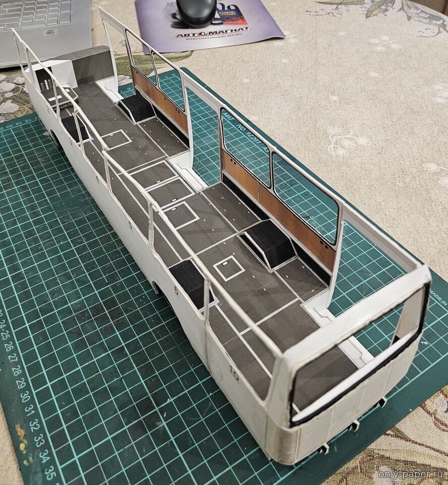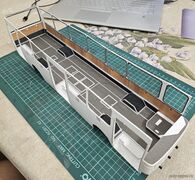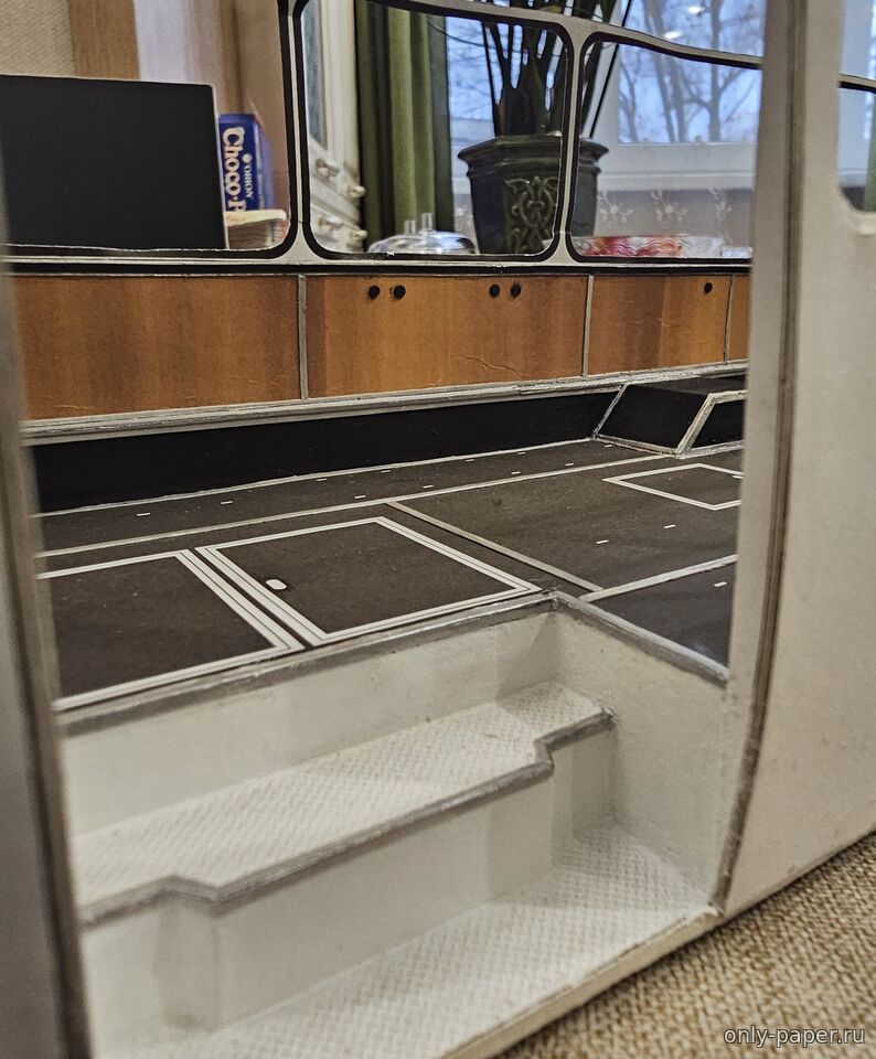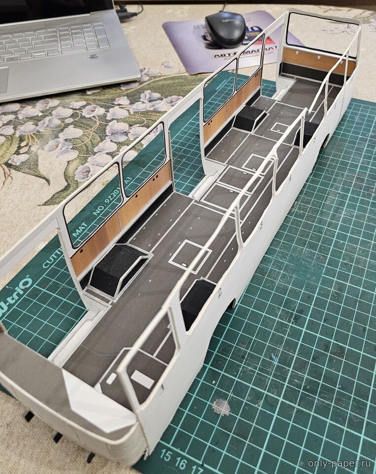 | Поработал с полами и внутреннней облицовкой. Найденные косяки вот по именно этому синиму Икарусу. На боковых листах под оргалит даже нет намека на присутствие в интерьере нижних выступов корпуса под ногами. Странно, в журнале с красным икарусом они хотя бы прорисованы, там есть. Почему разраб их не предусмотрел и они не перенесены из другого журнала- не понятно. Также соответственно и нет прорисованных на боковинах полос профилей, крепящих эту самую чистовую "обшивку" салона к корпусу. Нет круглых выводов воздуховодов.В общем все ушло в самостоятельный допил, т.к нарисованные местами профиля и отсутствие элементарных необходимых деталей не устраивают в таком масштабе. На пол, крылья и боковины добавлены профиля из серебрянки ( Бумага покрывалась заранее серебряным акрилом и шинковаласть на мелкие полоски шириной 1-1,2 мм ). Сзади вертикально по корпусу от пола до потолка возле заднего окна добавлены широкие каналы воздуховодов. В модели их тоже нет. Снизу сделаны выступы корпуса с профилями. Добавил кружочки вентиляции салона ( плашка черного цвета с заклепками 2мм от Моделик ). Далее работа с внутренней частью окон и т.д. Надо все приводить в порядок. Продолжение следует.