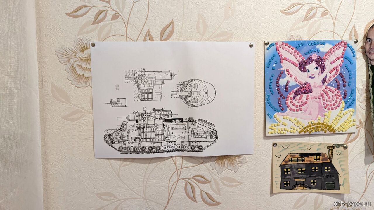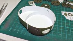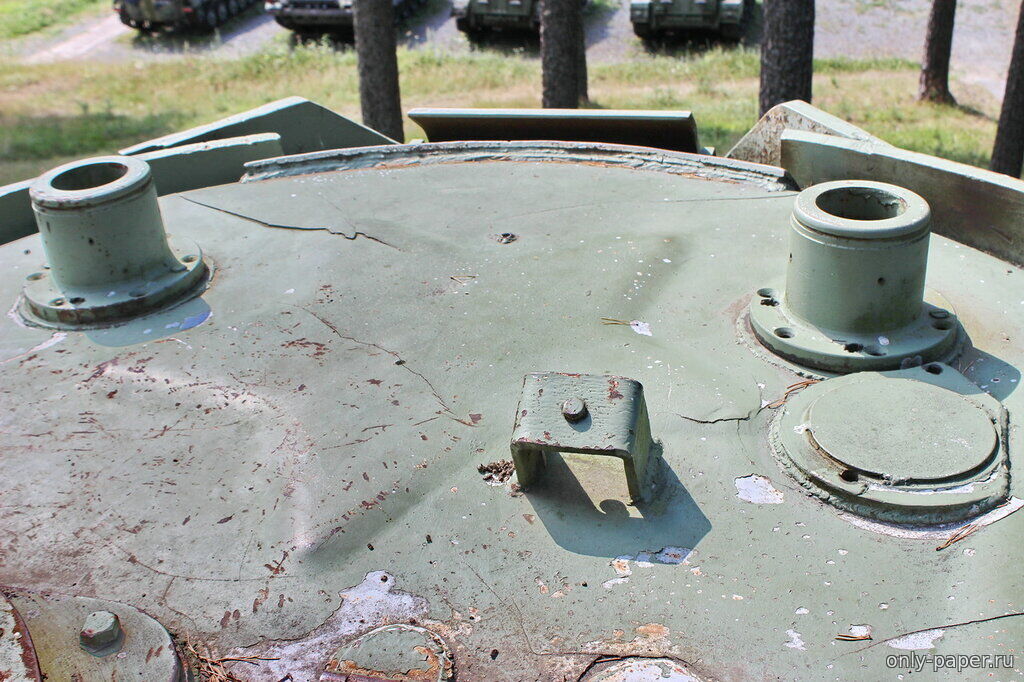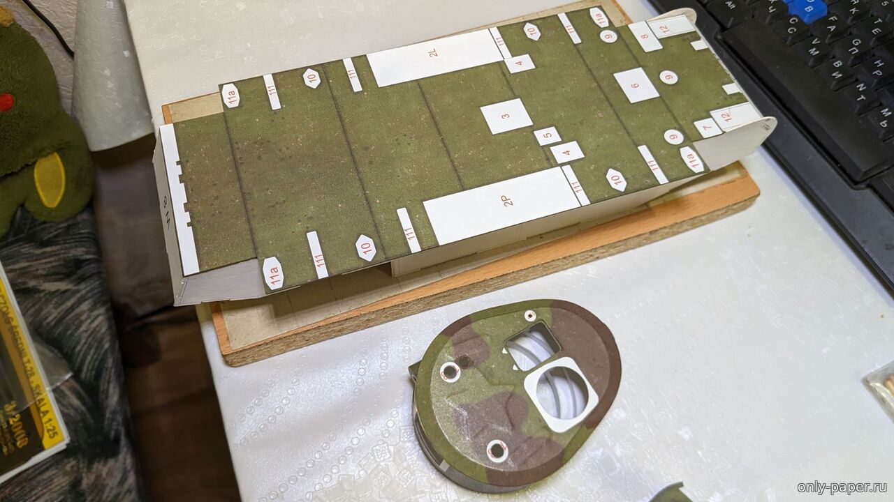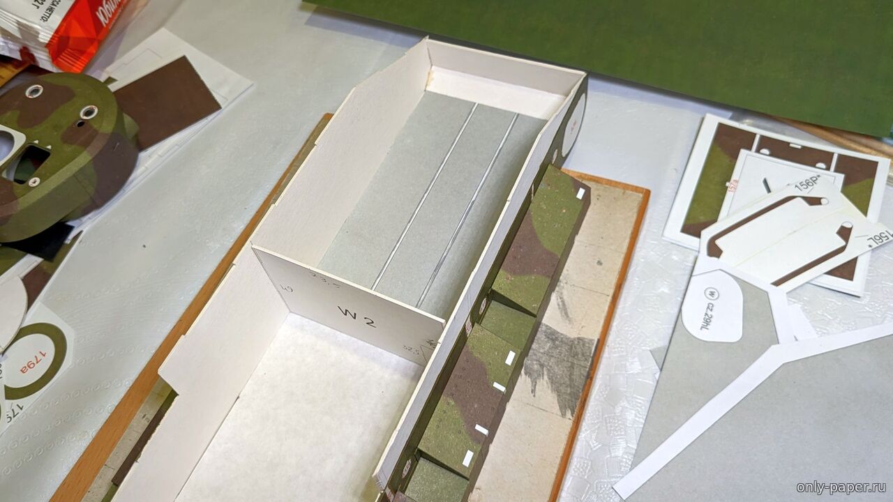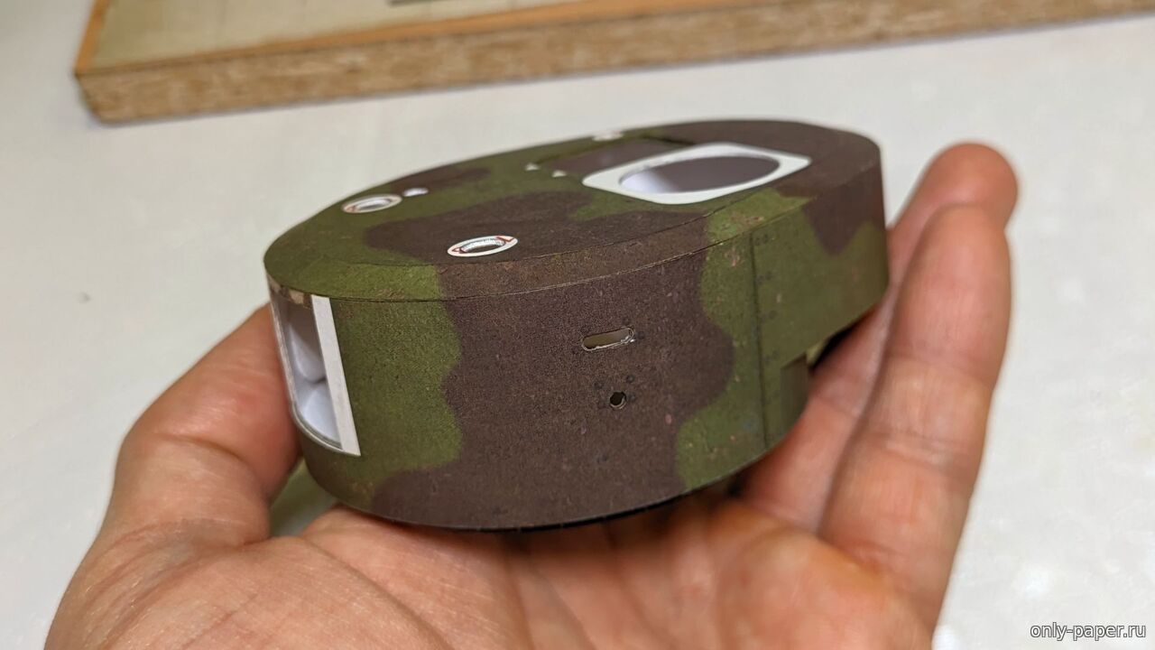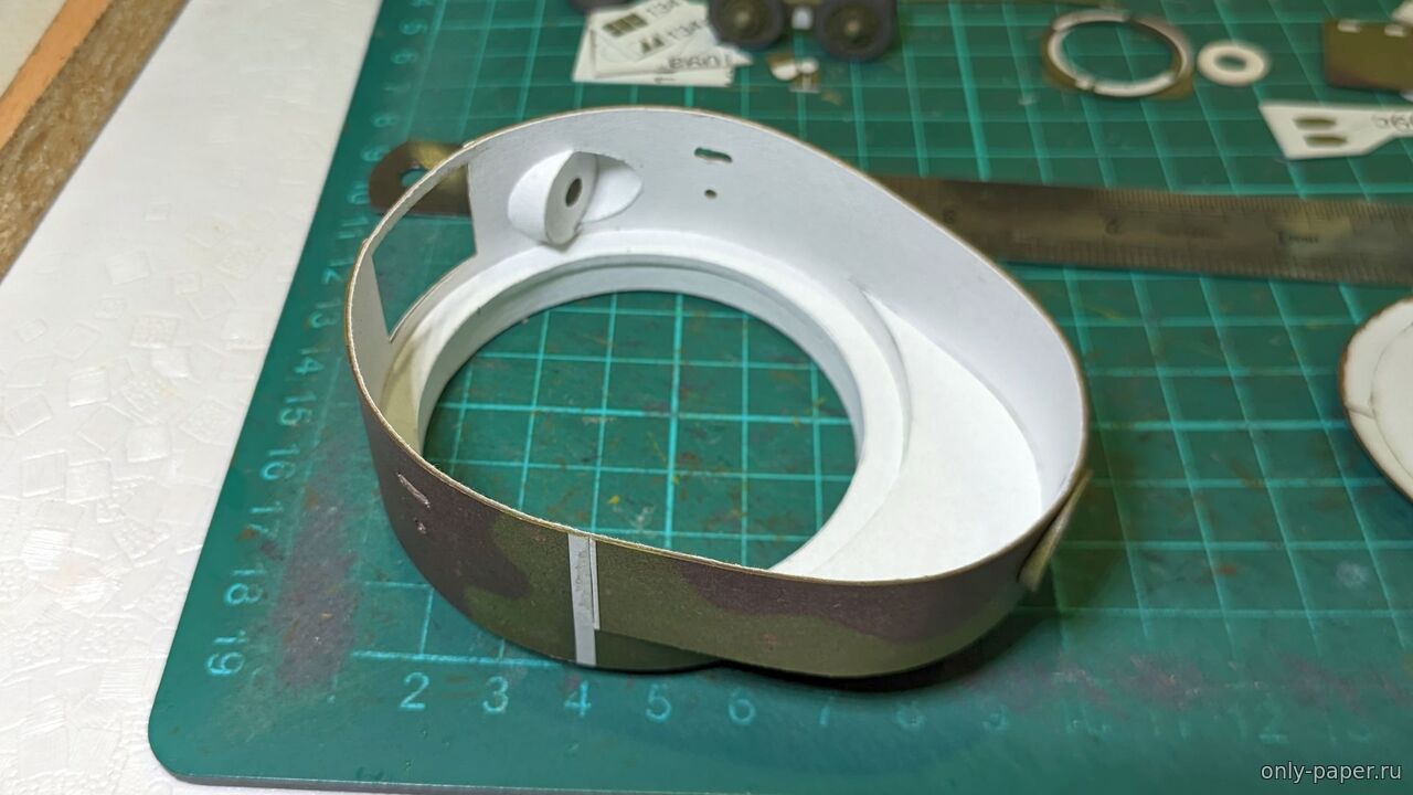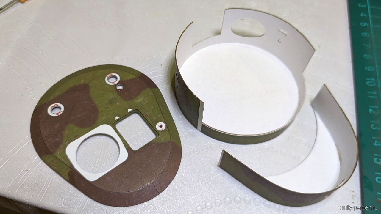 Потом прорезал люки, приклеил скос по периметру крыши и начал собирать стенки, к ним приклеил днище, затем ниши пулемётов. Изнутри обклеивал белым картоном. Чтобы стенки держали форму цилиндра, временно вставил круг из картона.