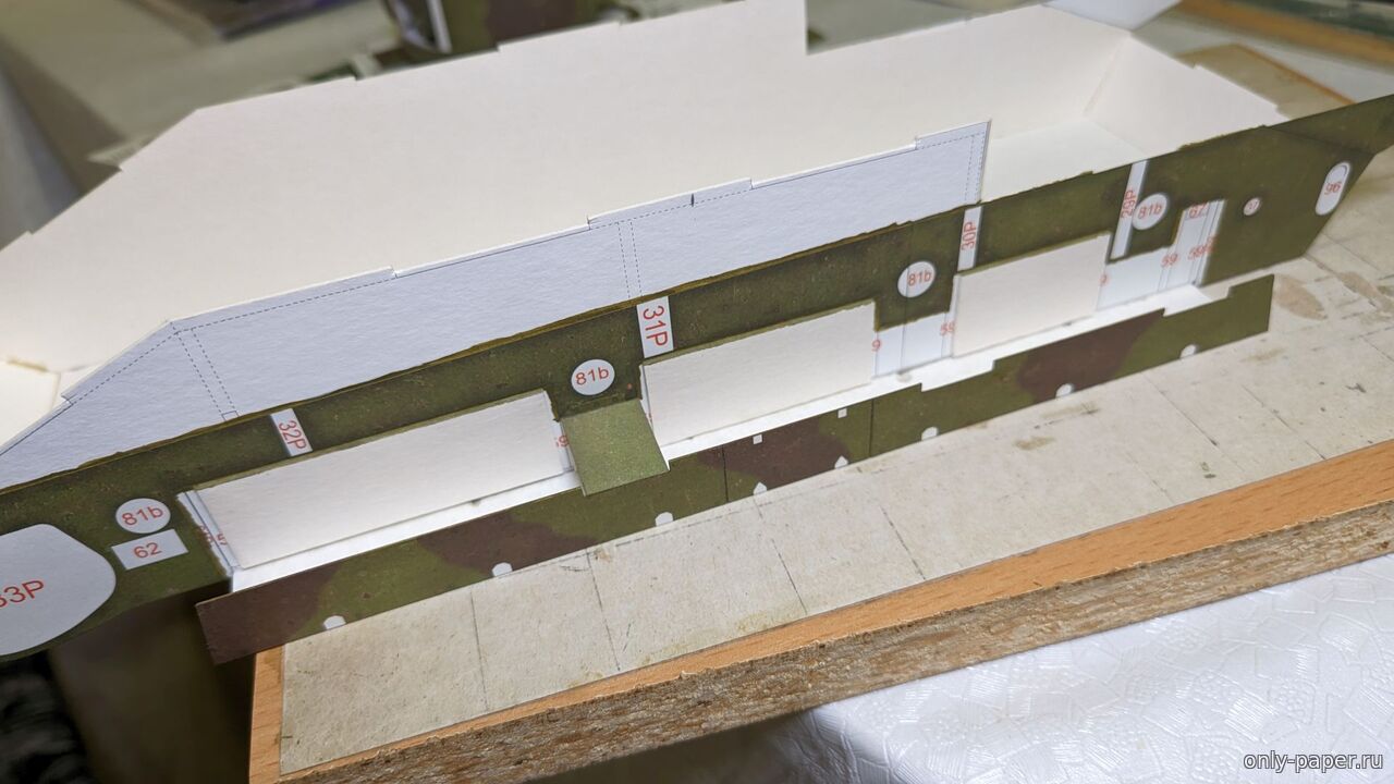 После этого наклеил самую большую деталь обшивки - днище, а также нижние части бортов, они даны двумя деталями, причём сразу с нижней частью крыльев, которые отрезал: