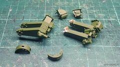 | Сборка началась с самой проблемной части - гусениц, попытка собрать их из покупной лазерной резки провалилась, я так и не смог просверлить траки вдоль для установки осей: пивной картон сразу расслаивается, если же его пропитать супер-клеем, то начинают отламываться крайние части траков. Вдоволь помучавшись решил скомбинировать журнальный вариант с собственной резкой. Из термопластика сделал шаблон для формовки тела трака, а грунтозацепы и гребни нарезал лазером.