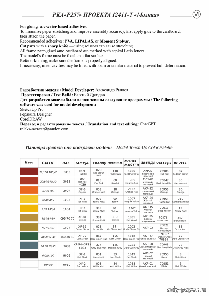 | мелкие детали на самом деле есть и и очень много.Есть каста моделистов, для которых это и есть самый кайф ,но для тех кто попроще может их не делать. Так как эти места просто нарисованы, либо вообще не делать.Сейчас готовлю файл для лазерной резки (Возможно его использовать для травлёнки)мелочовки и составил таблицу цветов разных фирм как эталон для подкраски на основе оригинальных цветов ,а на это ушло дофига времени,или полной перекраски для тех кто хочет уйти от бумажности.Сейчас пока что не могу выложить фото тестовой сборки без разрешения,но они будут .Идёт подготовка ролика для интернета процесса сборки .После будет Выложен на российских файлообменниках.О возможности забрать деньги из за санкций речь уже не идёт.Цена по сравнению с журнальным вариантом с учётом распечатки в салоне как подсчитал будет на порядок ниже,но это даёт преимущество так как можно распечатать запасные детали, а так как журнал векторный, то можно сгруппировать так как хочешь. и печатать только то,что тебе нужно