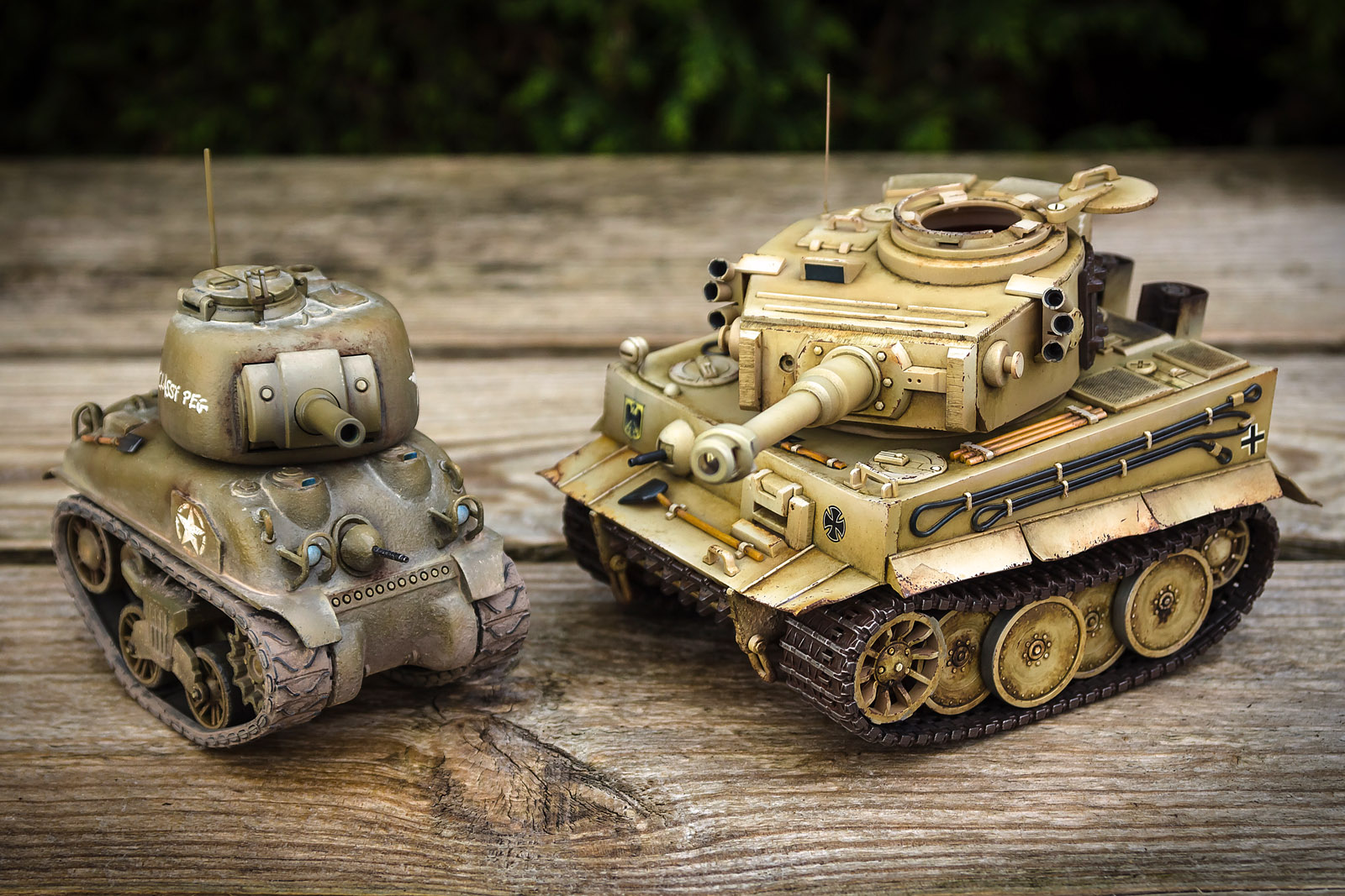 Я сам приверженец максимальной копийности (без фанатизма), но я считаю что своего рода карикатуры на военную технику тоже имеют место быть. Вот взгляните к примеру на Тигра с Шерманом (под спойлером), кто-то собирает точную копию со всевозможными допами, а кто-то карикатуру... ну и что тут плохого?