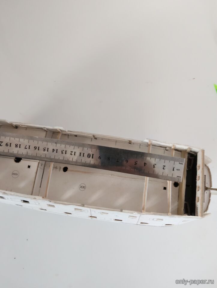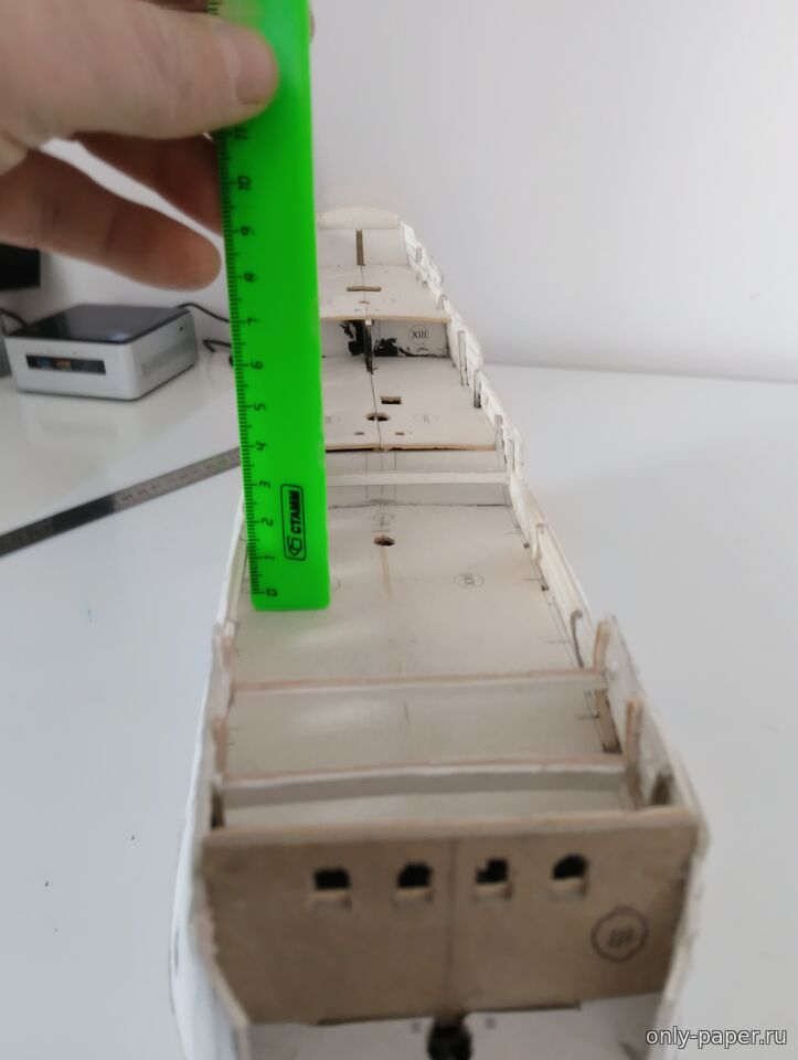 и вот он.  Далее, есть чертёж на котором есть масштабная линейка, вот измерим расстояние между центрами мачт. Как видим всё на своих местах, с учётом того,что от модели БМ отрезано 5см между гротом и фок мачтой.