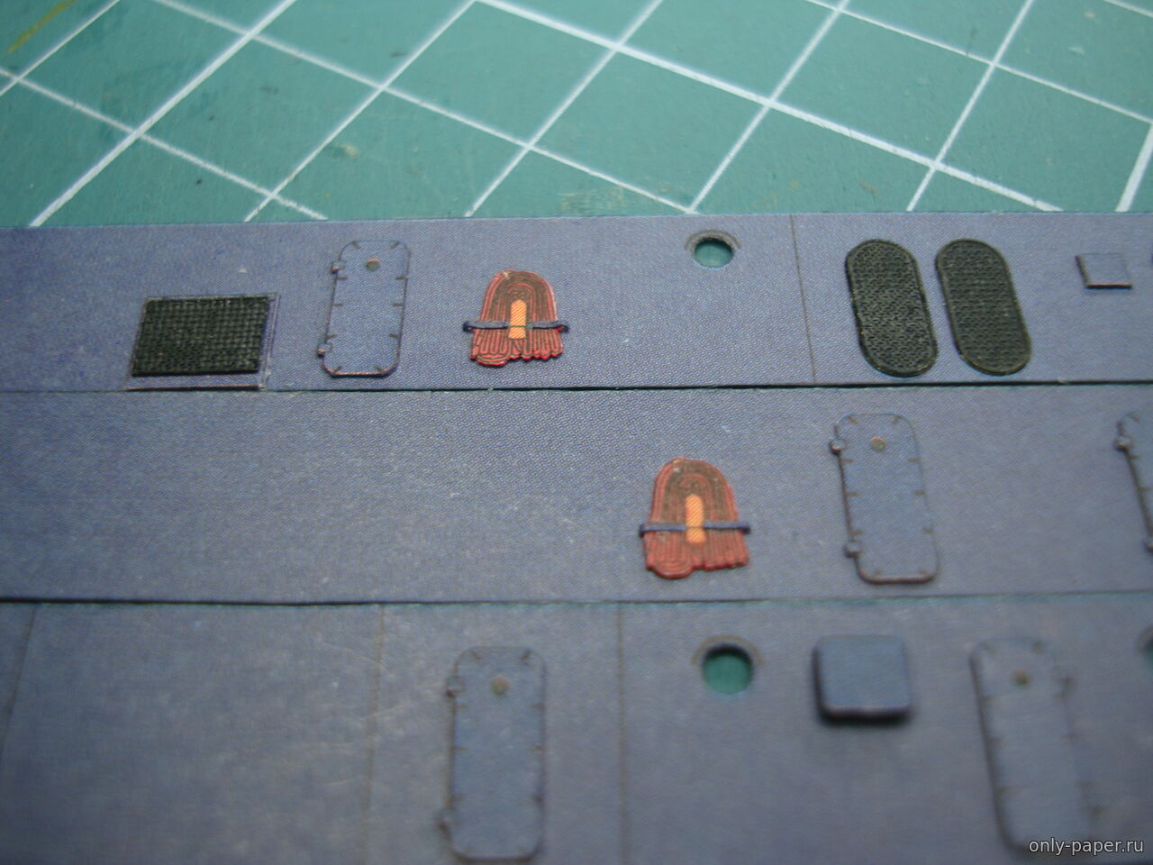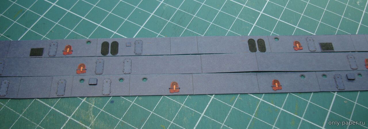 кстати щели в стыках обшивки по своей сути это неизбежность (да, да, в моем случае это кривизна моих рук которые растут скорее всего не из плеч))))), в силу ручной резки деталей, но есть и нюанс, моделист может эти стыки максимально замаскировать правильным подбором краски для торцов и склеек, и тогда, щели, когда они есть, видны только при особых условиях - съемка хорошей камерой в режиме макро, с мощным освещением с нескольких сторон, а не телефоном с расстояния вытянутой руки))) ну а невооруженным глазом нужно присматриваться с очень близкого расстояния