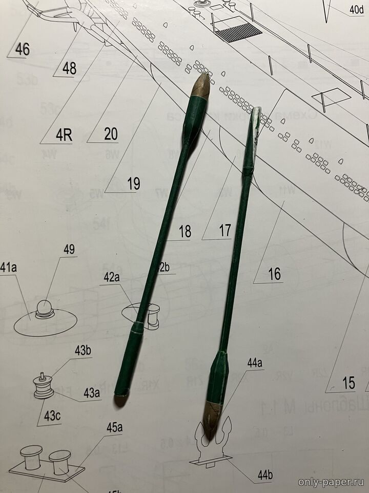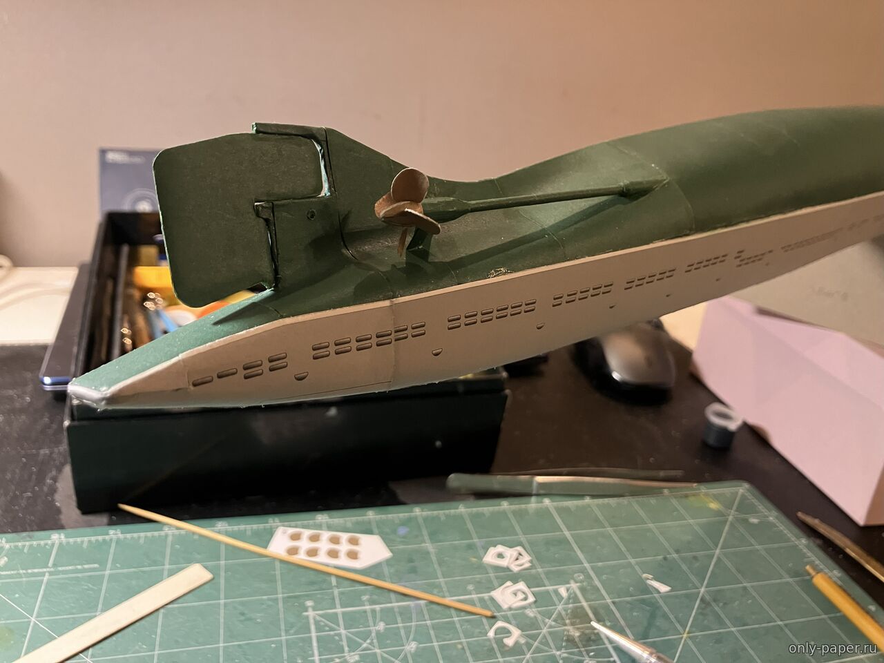 | Красить опасаюсь, да и хочется чистый картон иметь. Да и надоело с корпусом возиться, хочется уже деталировку делать. Плюс на обшивке есть несколько типографских имитаций крышек торпедных аппаратов, которые утратятся.