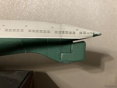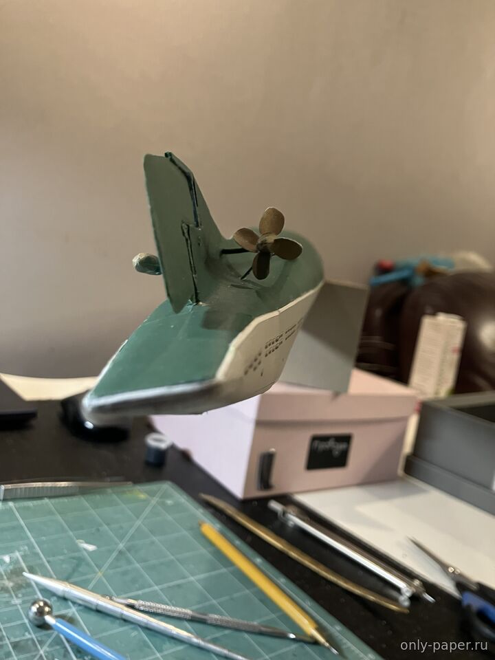 Дейдвудные трубы долго выравнивал по месту, но все равно вышло не идеально. Стыки тонировал жидким акрилом и простым карандашом. Горизонтальный кронштейн сделал не по плану разработчика, разрезал на две половинки. Ну и известная проблема с тем что выкройки для кронштейна не отзеркалены. Закрыл странный уступ на корме запасом цвета.