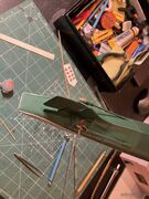 | В 100 масштабе дура очень большая, это накладывает свои нюансы По черновому каркасу обшил сканами обшивки на тонкой бумаге, чтобы понять уровень сходимости и обозначить ватерлинию. Некоторые провисы усилил накладками.