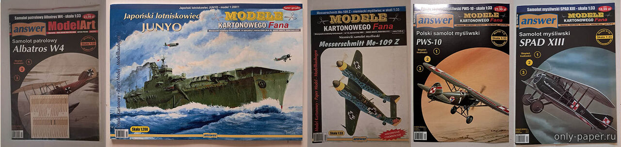 Albatros W4 (+ комплект лазерной резки крыльев) - 21 бел. руб. (700 рос. руб.) IJN Junyo - 39 бел. руб. (1200 рос. руб.) Messerschmitt Me-109Z - 21 бел. руб. (700 рос. руб.) PWS-10 - 21 бел.руб. (700 рос. руб.) SPAD XIII - 18 бел. руб. (600 рос. руб.)