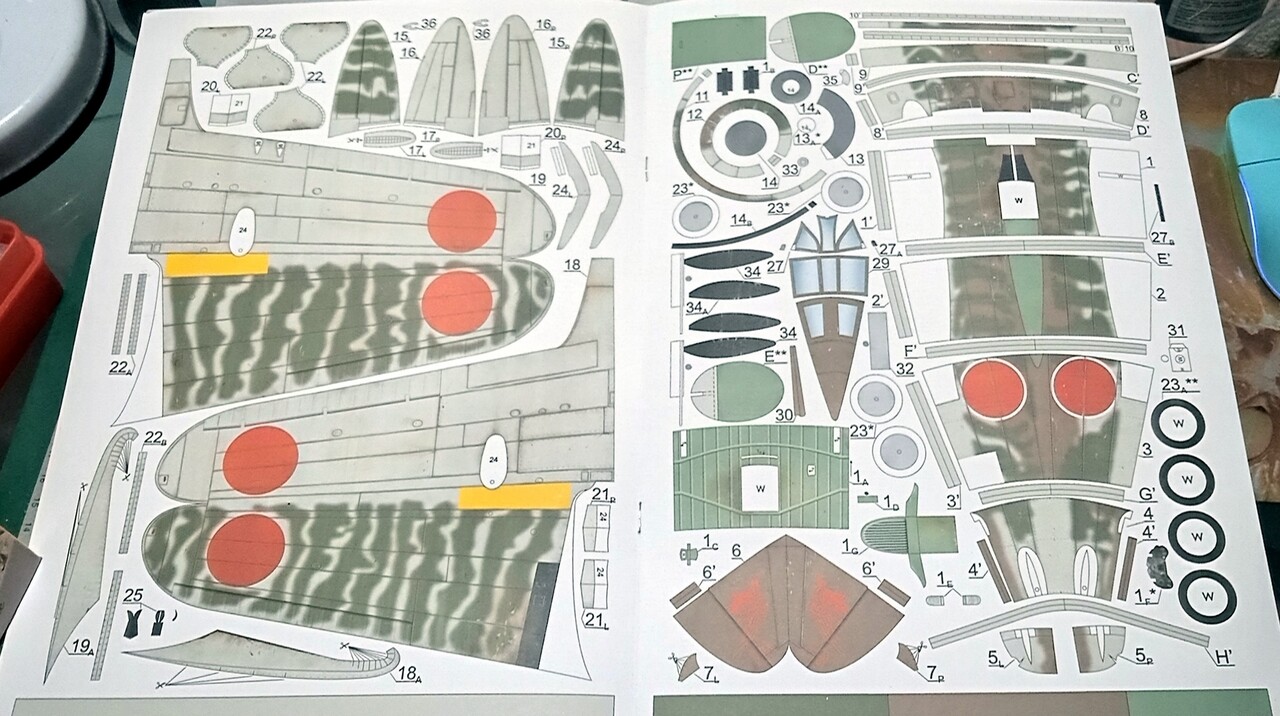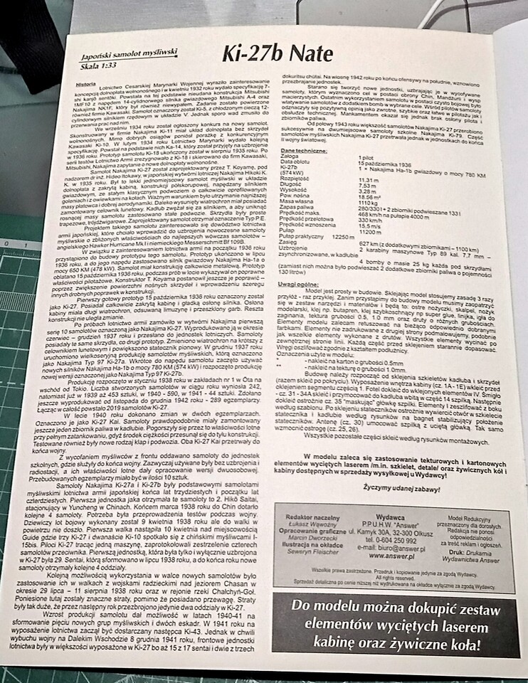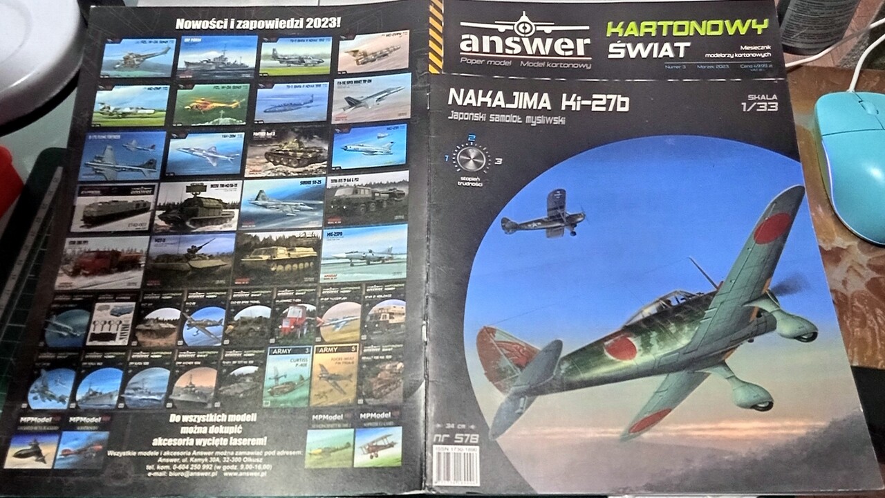 | Зачем я делаю обзор на этот журнал -непонятно (но как бы сказал Портос-картонщик,-А я делаю обзор просто пототу,что делаю обзор.).Японский армейский истребитель Ансвер напечатал в 2023 году ,довольно свежий журнал.Кто автор разработки не написано,указан только Marcin Dworzecki как опрацюватель графичный,тираж не нашёл,стоил в те года 49,99 Зл. Собственно сама обложка (перед и тыл) на страницу история самолёта и описание сборки  Сборочных схем раз-два и обчёлся на листе с каркасом зато лист анонсов  Ну и собственно сами детали (на двух листах поместились),теперь вы понимаете что делать анализ этой модели такое себе. Если вы присмотритесь увидите на дет.3 белый неокрашенный квадрат ,так он потом и на модель перейдёт.Да,я ещё не поленился и приобрёл резку  Вывод -разработка крайне примитивна,хотя визиринг хорош.Журнал должен стоит небольшмх денег ,тогда он уместен-покупать его на озоне за 2126 руб.решительно не стоит.