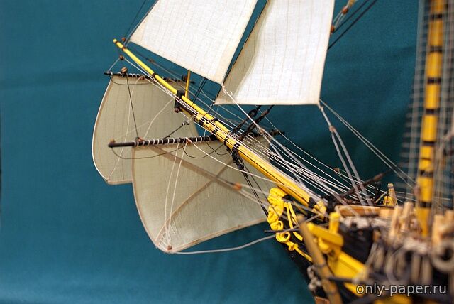 | "Навесил" все 4 грот-стакселя для примерки: . ... и возникли понятные вопросы. После изучения поставленных стакселей на других моделях, пришел к такому варианту: . Так нравится. Так и оставлю. Грот-стаксель и брам-стаксель сняты и пошли в архив. Занялся такелажем оставшихся на модели стень-стакселем и бом-брам-стакселем.