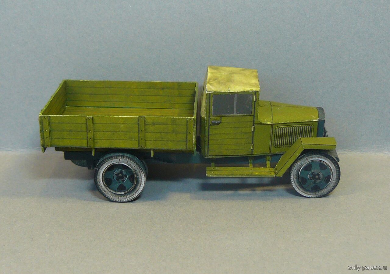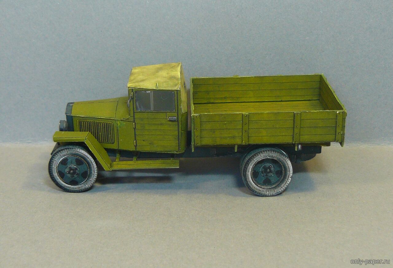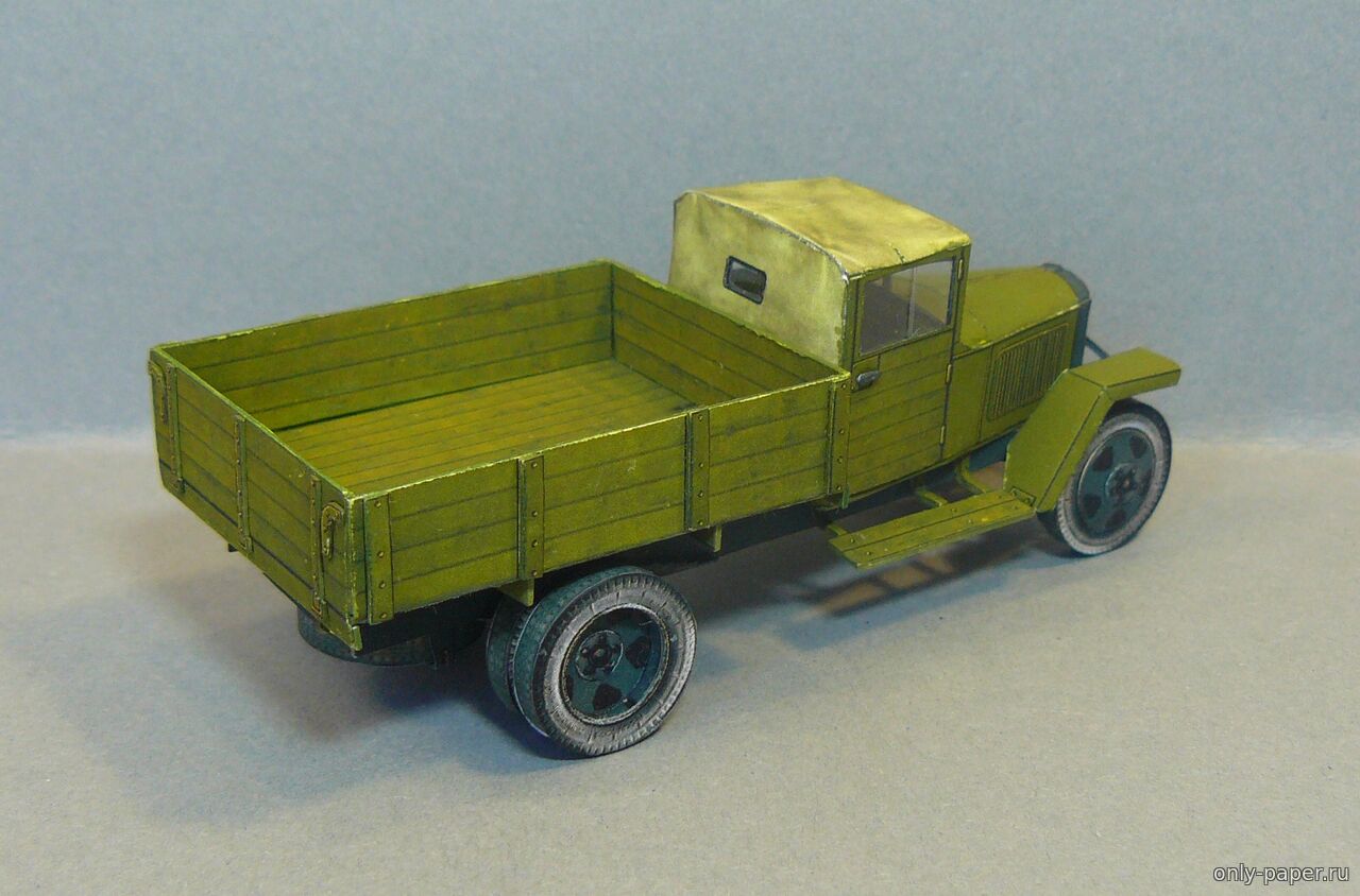 | Коллеги, представляю Вашему вниманию модель полуторки ГАЗ-ММ в масштабе 1/50, за выкройки большое спасибо АК71. На модели сымитировал сетку на капоте, сделал фару с остекление, на боковых стеклах кабины сделал нахлест, добавил рельефа на заднем борту. Рама - коробочка, без доработок. Рессоры набираю из полосок бумаги, ориентируясь на выкройки, чтобы не ломать пальцы, вырезая их из толстого картона. Боковины шин, конечно, светловаты, но тут вина еще и подсветки при съемке.