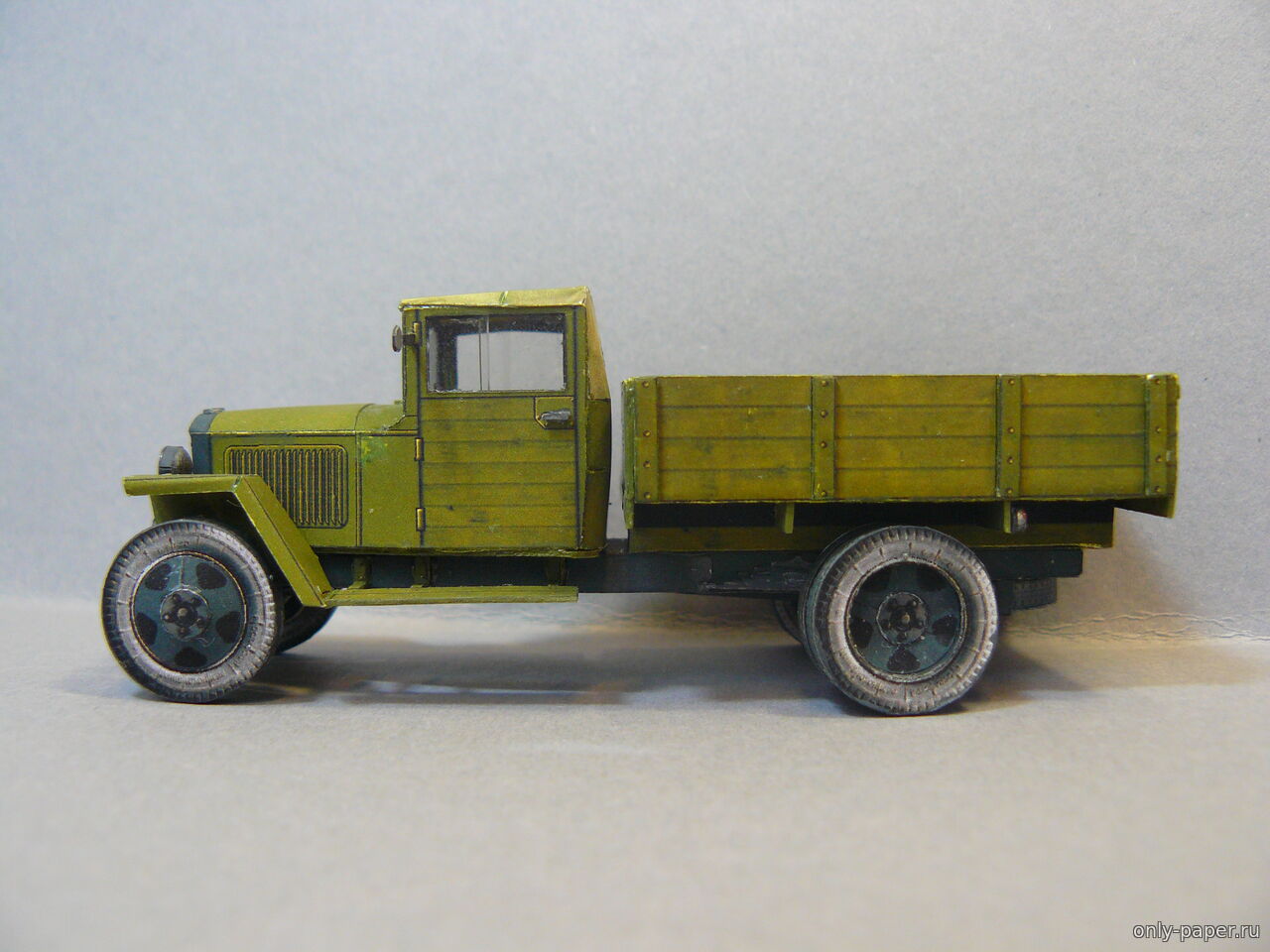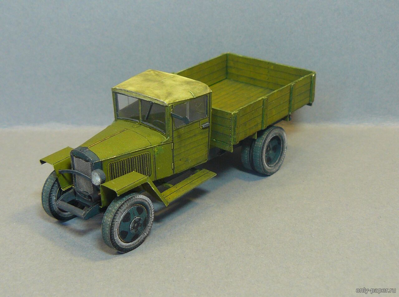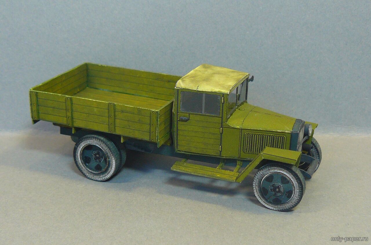 | Коллеги, представляю Вашему вниманию модель полуторки ГАЗ-ММ в масштабе 1/50, за выкройки большое спасибо АК71. На модели сымитировал сетку на капоте, сделал фару с остекление, на боковых стеклах кабины сделал нахлест, добавил рельефа на заднем борту. Рама - коробочка, без доработок. Рессоры набираю из полосок бумаги, ориентируясь на выкройки, чтобы не ломать пальцы, вырезая их из толстого картона. Боковины шин, конечно, светловаты, но тут вина еще и подсветки при съемке.
