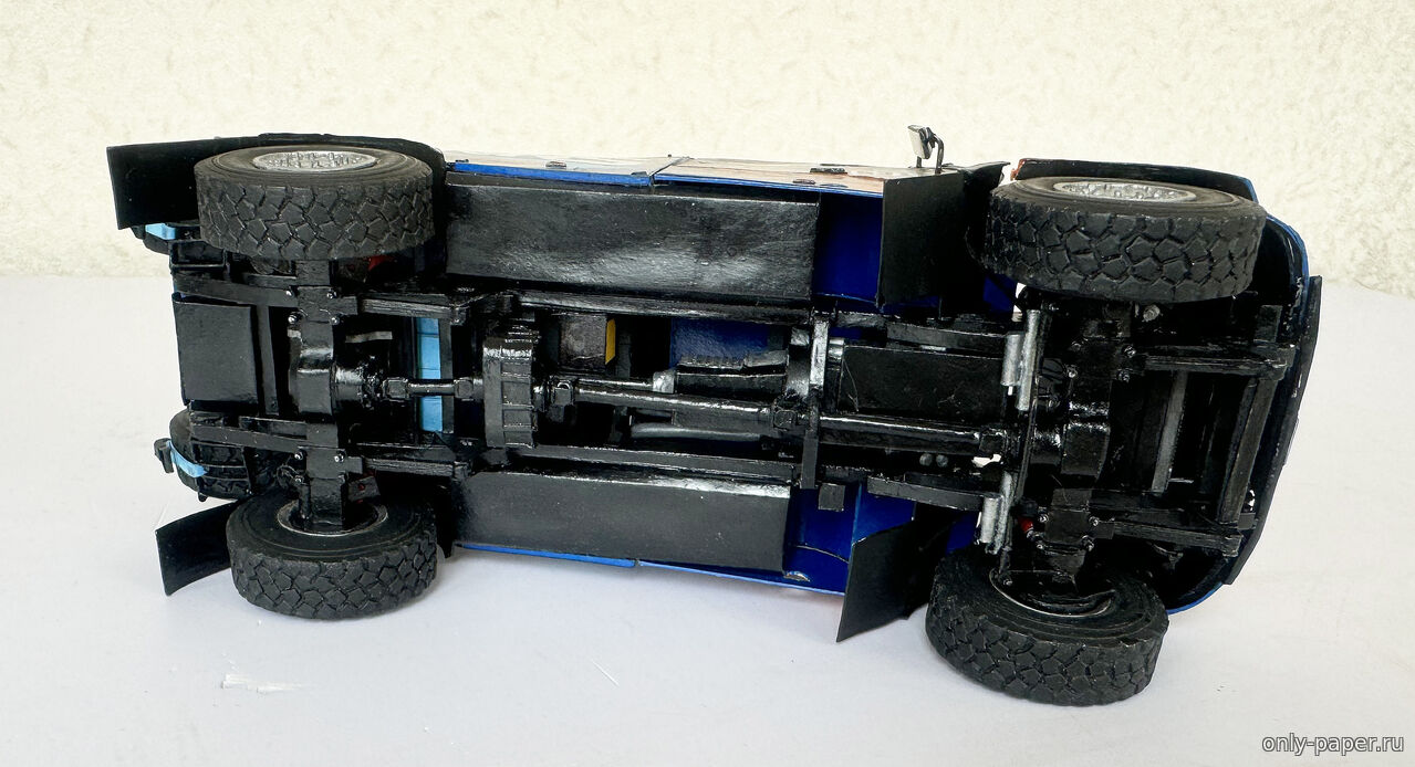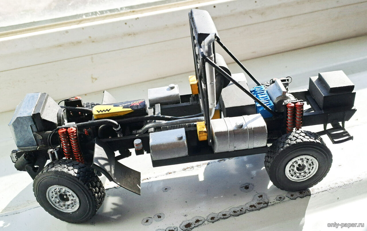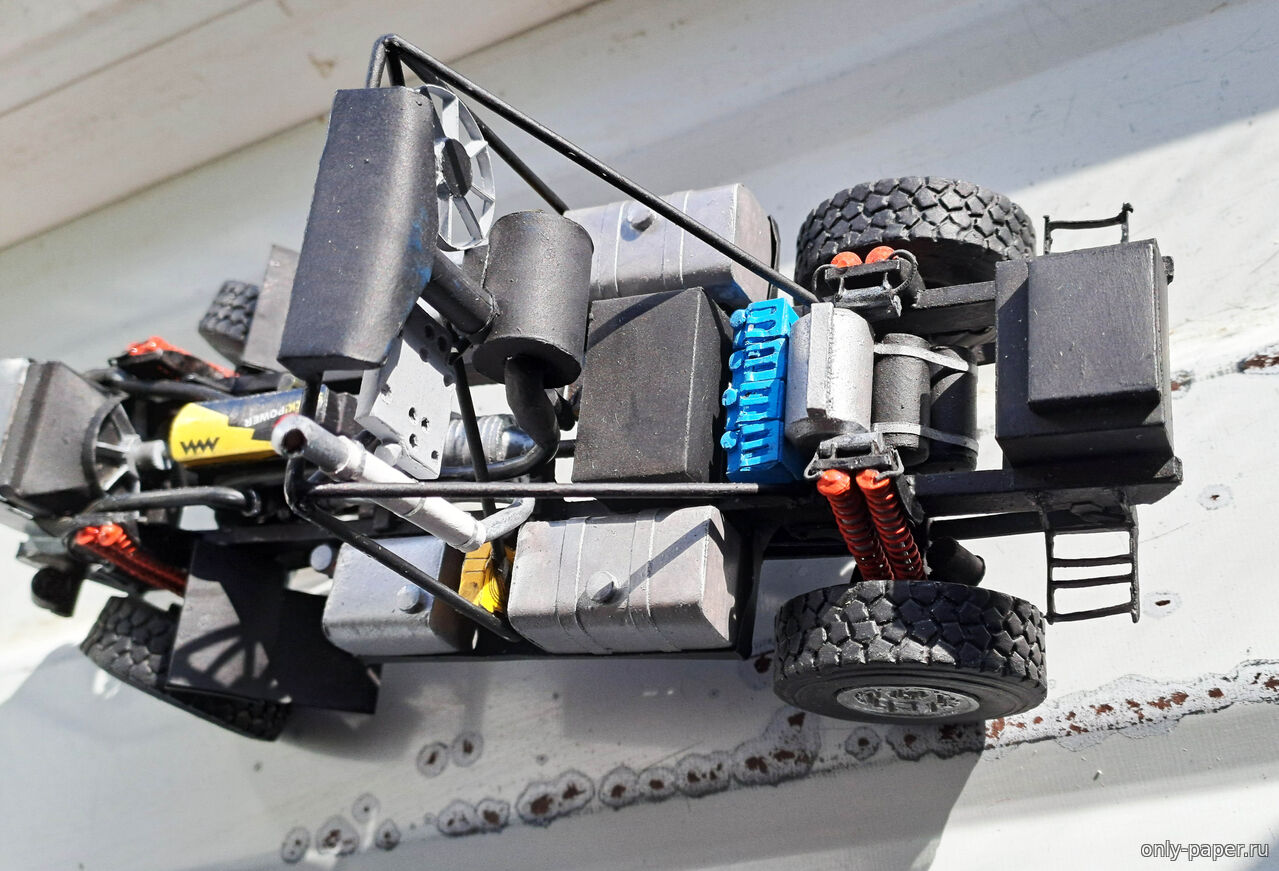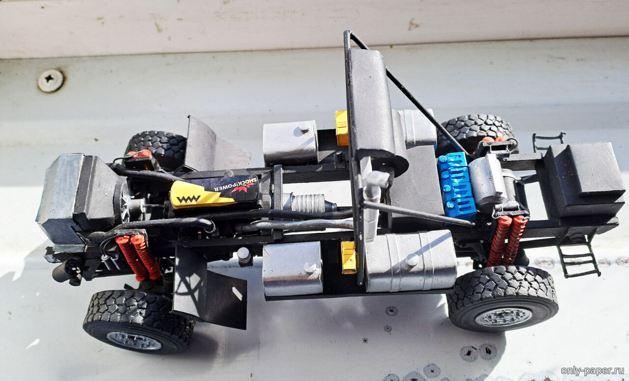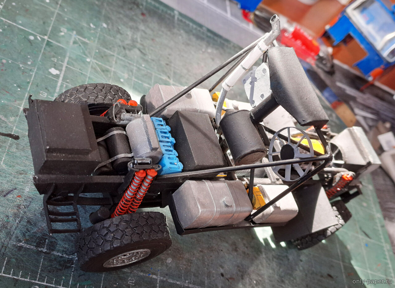 Внутренности, колеса крутятся, передние поворачиваются. Трубопроводы сделал из подходящего провода- в журнале предлагали собрать из бумаги.Раму и колеса покрасил, а верх покрыл лаком.