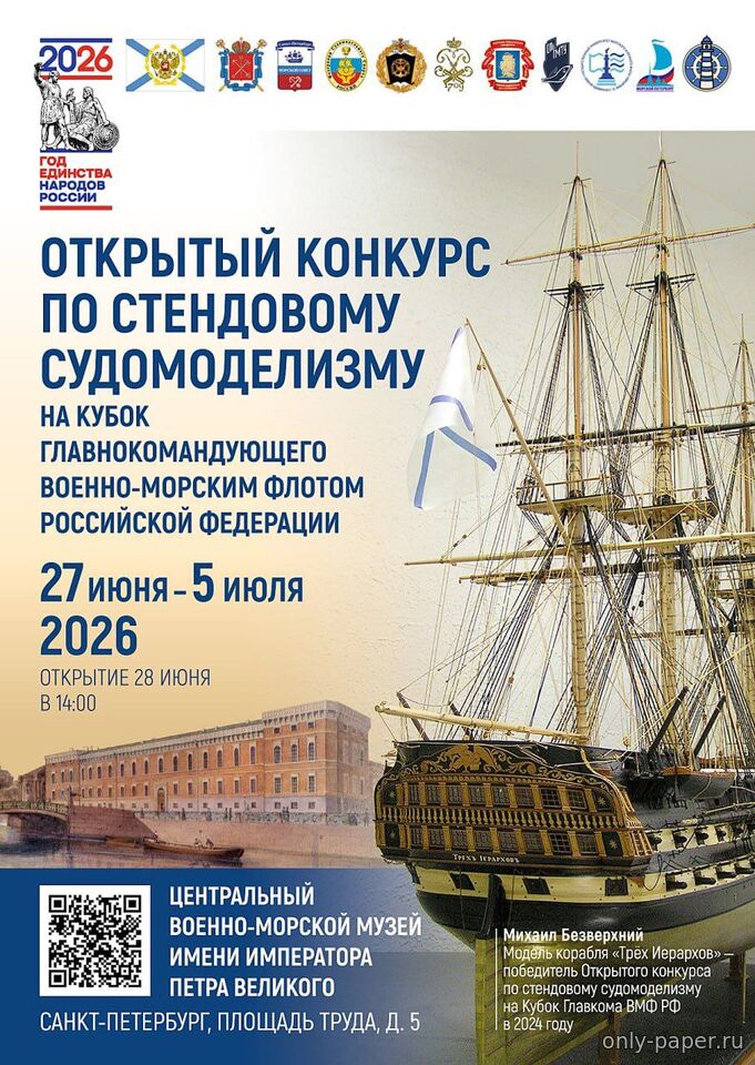 | Открытый конкурс по стендовому судомоделизму на Кубок Главнокомандующего Военно-Морским Флотом Российской Федерации. Пройдёт с 27 июня по 04 июля 2024 года в Санкт-Петербурге, в ЦВММ. Положение размещено на сайте Академии Сенявина: Сотрудничество в области Культуры — МТК им. адмирала Д.Н. Сенявина (spbmtc.com) Прощу обратить внимание - в классе картонных моделей введён подкласс С7S, модели подводных лодок и подводных аппаратов. Если в этом подклассе не будет кворума из 4-х моделей от 3-х моделистов, они перейдут в класс С7 и будут участвовать в конкурсе вместе с остальными бумажными моделями.