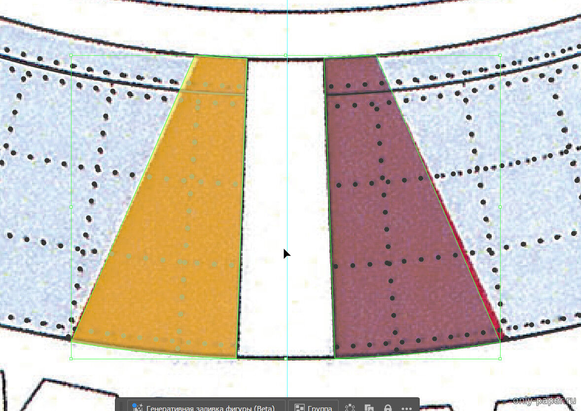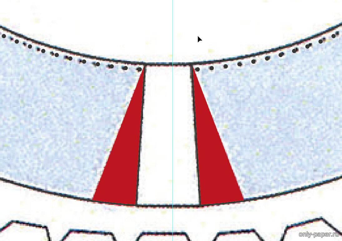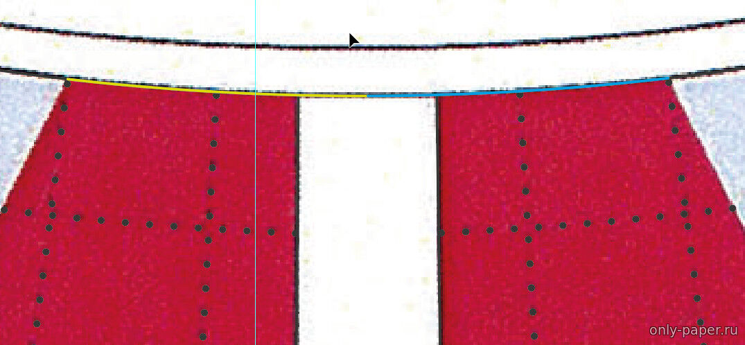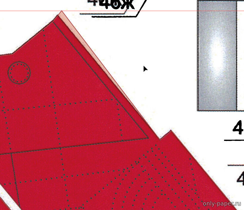 Как видите точки расположенные близко друг к другу часто сливаются вместе после трассировки, и линии имеют неровности. Это меня не устроило, и я решил перерисовать все детали, которые будут на виду, вручную. Особый вид мазохизма когда лист отсканирован не под прямым углом, детали расположены под наклоном, хотя и это исправляется поворотом листа. Так еще и детали не всегда симметричны. Далее начал все перекладывать на А4 согласно раскладке в 13м номере, и уже на месте добавлять красный цвет. Начал с хвоста: Первая деталь 27г там все ок. Нарисовал правую половину отзеркалил, попал идеально. Вторая деталь 27в, нарисовал правую часть отзеркалил, промах со смещением в миллиметр. Ну хорошо, пошел от обратного, отложил на 27г и 27б отрезки на торце где есть красный цвет, перенес отрезки на 27в, на их основе вывел пятно красной заливки, результат так себе.