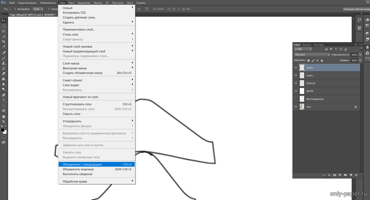 | Далее в верху экрана заходим в "СЛОЙ" - "ОБЪЕДЕНИТЬ С ПРЕДЫДУЩИМ", кликаем...