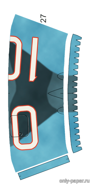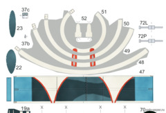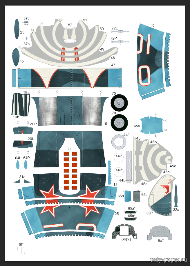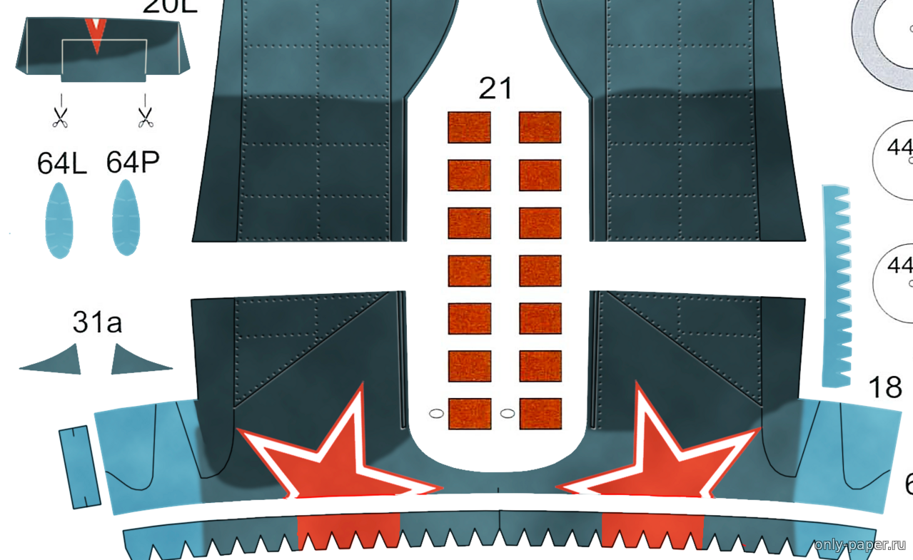 | Кстати, детали 64 - это те самые бомбодержатели, точнее их обтекатели. Они в исходных выкройках есть, но на схеме сборки не отражены.