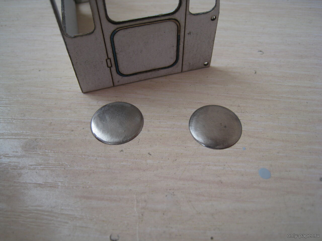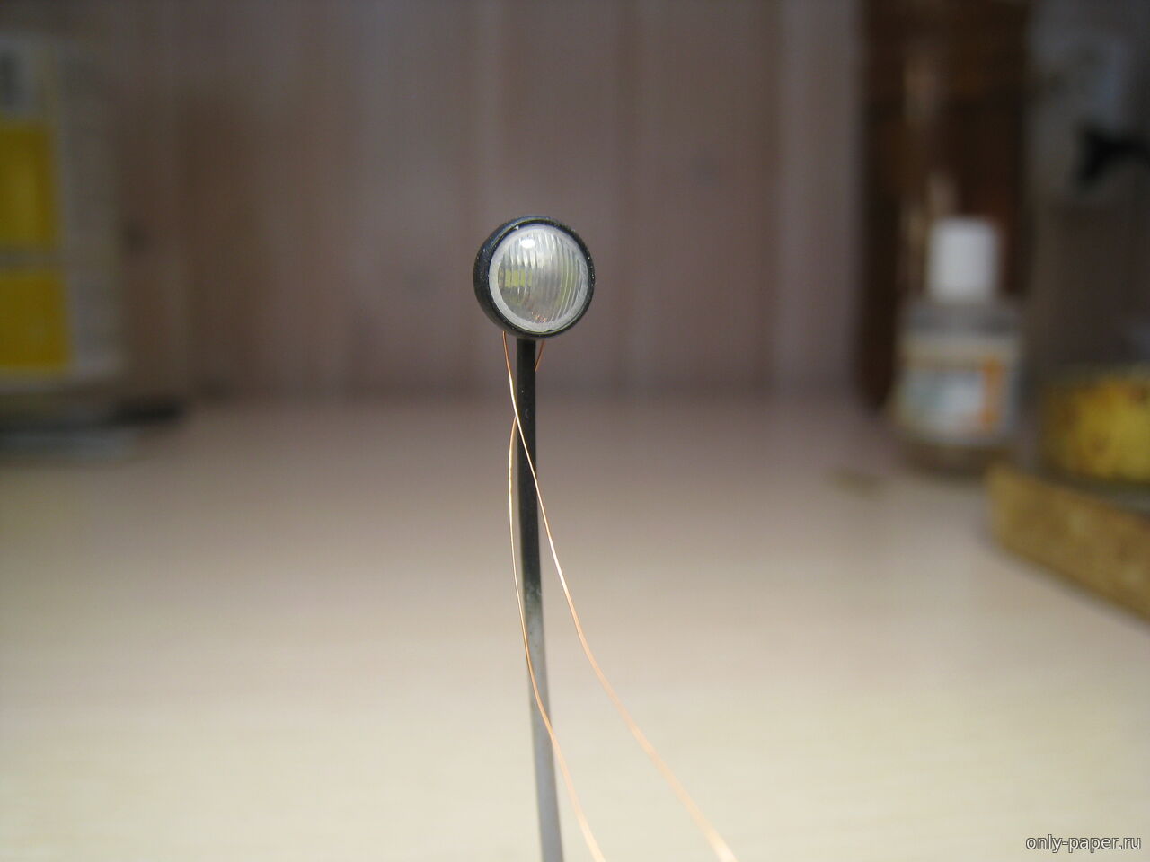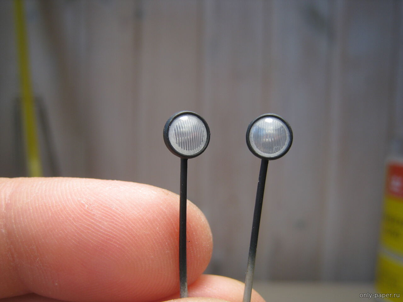 Захотелось, что бы на крыше были фары-прожекторы. Скопировал фары от Форд-3000 от Моделиста. Стекла гнул из рифлёной закладки для книг, типа переливашки. отражатель красил хром-маркером.